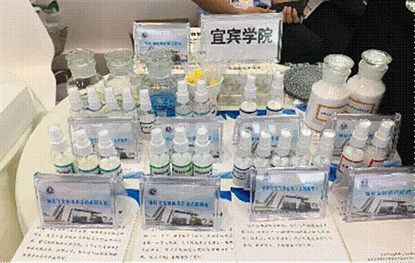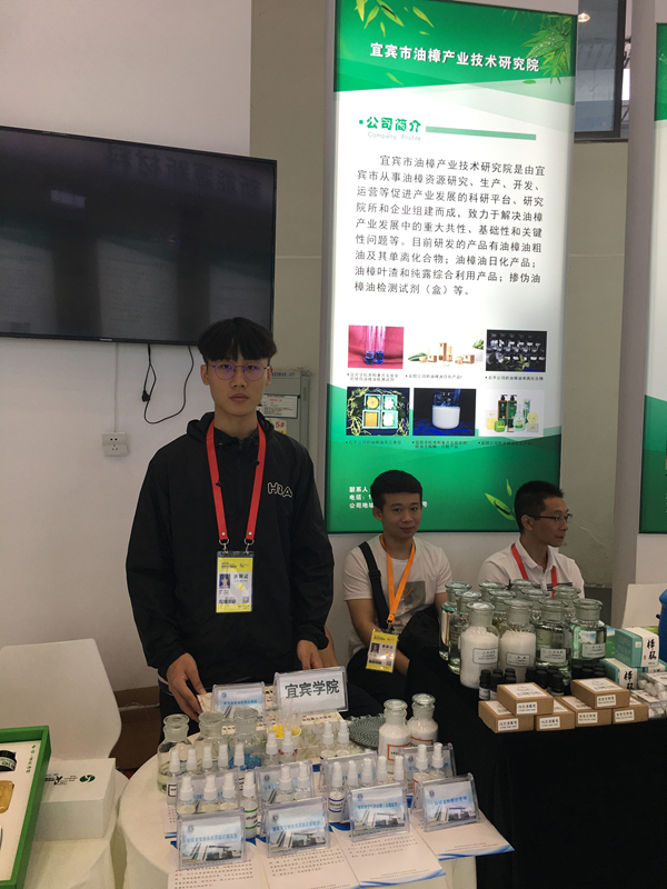 同学们到达四川省绵阳市后,在魏琴教授的组织下来到了博览会川南经济区宜宾学院展位,随即开始了我校油樟类科研产品的展示。