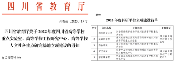 近日,四川省教育厅发布的《四川省教育厅关于2022年度四川省高等学校重点实验室、高等学校工程研究中心、高等学校人文社科重点研究基地立项建设的通知》(川教函〔2023〕15号),宜宾学院申报的“农食产品标准化与检验检测四川省高等学校工程研究中心”获批立项建设,本次全省共立项2个高校工程研究中心,宜宾学院为其中之一。